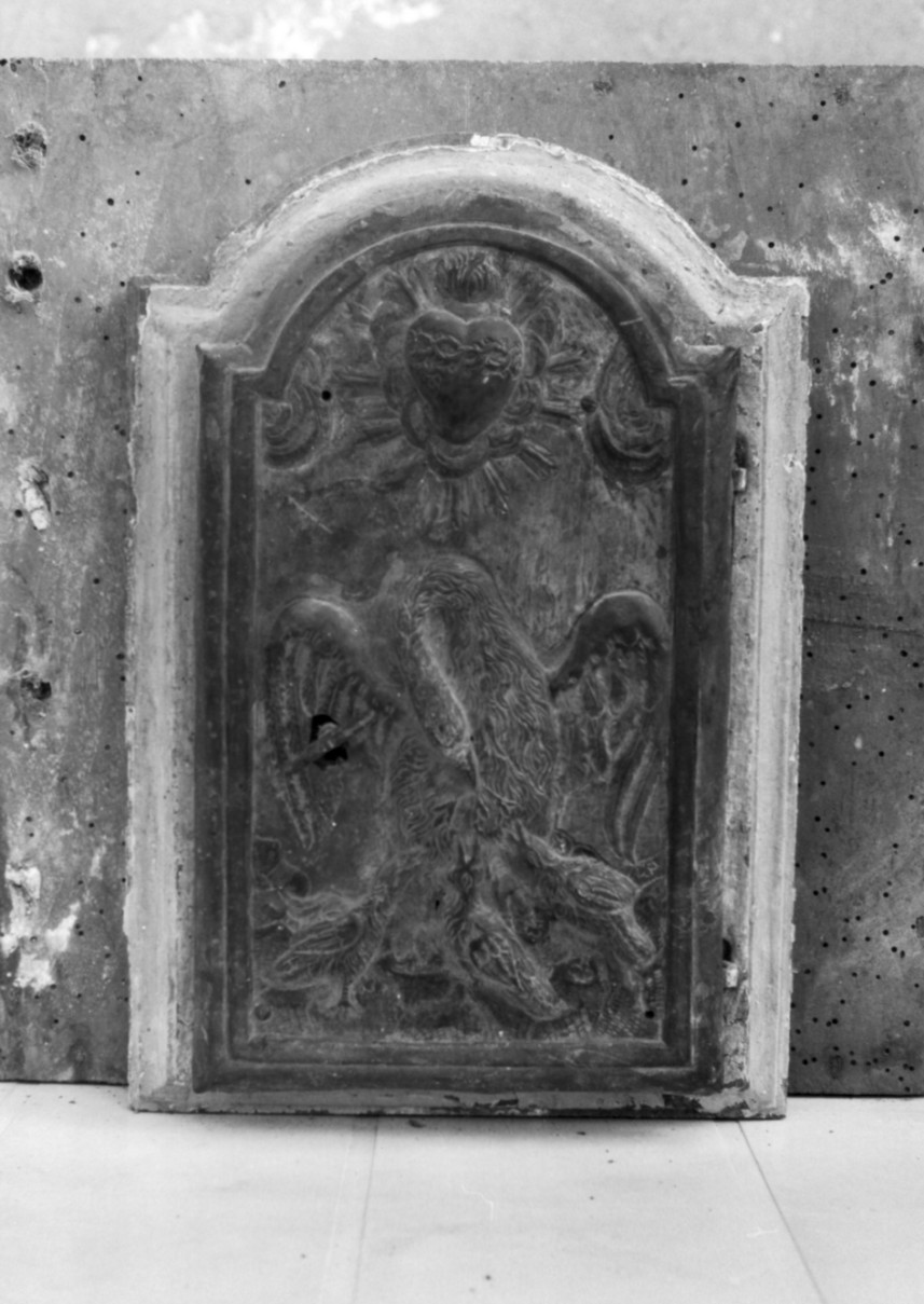 - NOTIZIE STORICO CRITICHE L'ignoto autore ricorre alle iconografie simboliche del Cristo (il Sacro C uore) e del Suo sacrificio per l'umanità (il pellicano), perfettamente con soni alla funzione del tabernacolo quale scrigno delle sacre specie, offre ndo una composizione equilibrata ed armoniosa incentrata sull'esile e sinu osa figura del pellicano, il cui raffinato dettaglio del piumaggio e delle gocce di sangue sgorganti dal suo petto - consapevole resa delle diversit à materiche - conferiscono, tuttavia, un certo realismo alla rappresentazi one