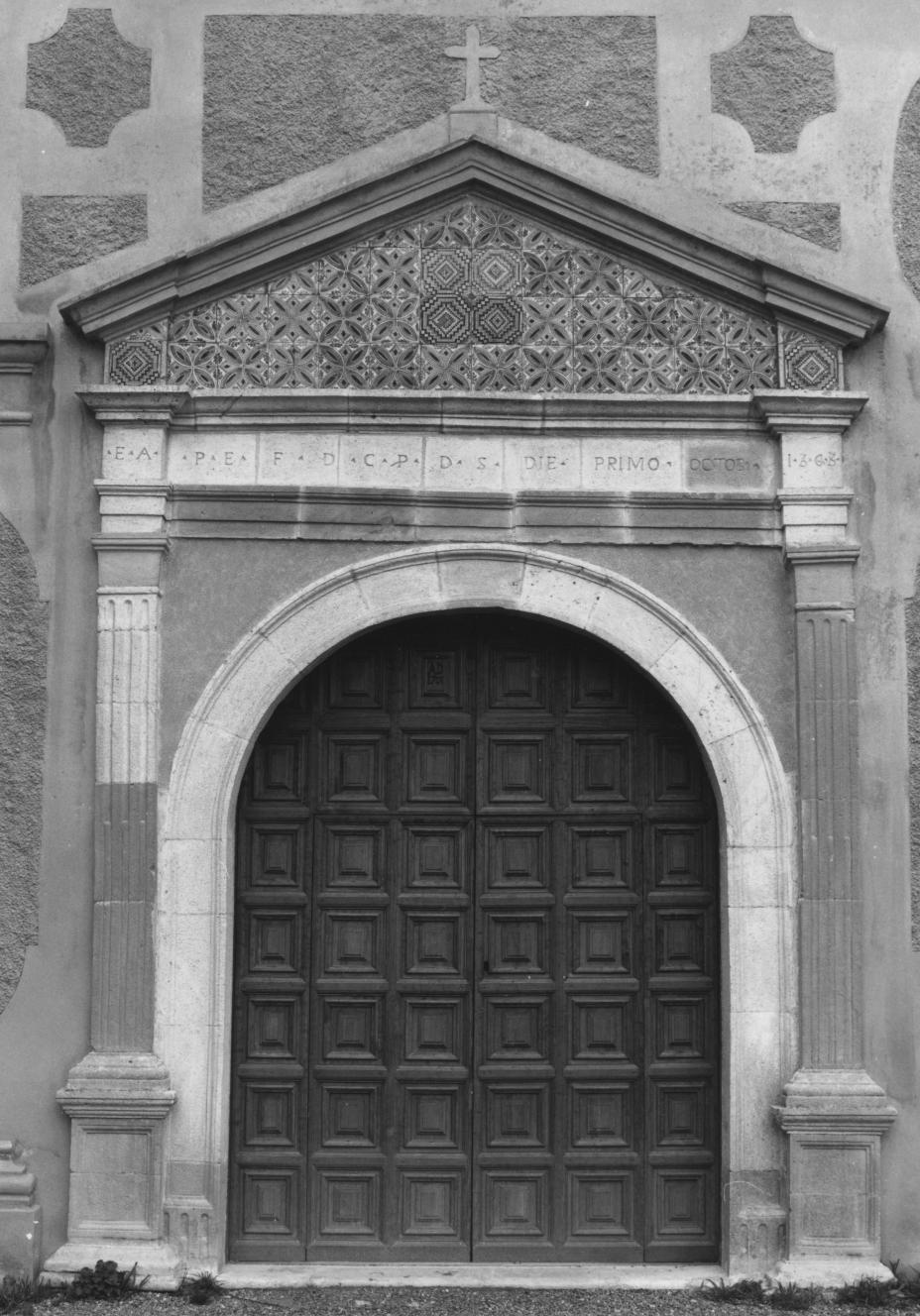 Portale ad arco, sormontato da un timpano, al culmine del quale èpresente un croce. Il timpano è decorato da maioliche
