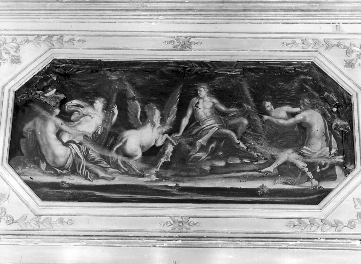 Soggetti profani: mitologia. Divinità: Apollo. Divinità minori: Ninfe. Animali mitologici: Pegaso. Strumenti musicali: lira. Paesaggi: fonte Ippocre ne