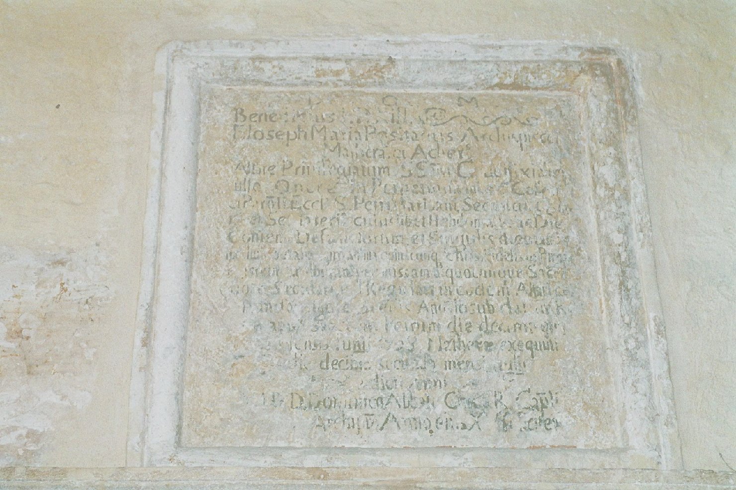 - ISCRIZIONI su più righe - D C M BENEDICTUS (...) ELOSEPH MARIA POSITANUS ARCHIEPI(SCOPUS) MATERA ET ACHIERENTIA/ (...) PRIVILEGIUM SS. CRUCIFIXIAM ILLO ONORE IN POSSESSIONEM/ (...) ECCL(ESIAM) S. PE(...)LLARI (...)/ DECIME SECUNDO MENDI (...)GLI(.. .)/ ARCHIEPISCOPUS ANNO (...) X 10 FEBB - lettere capitali -