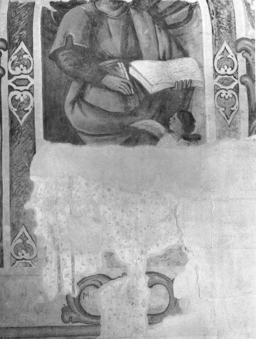 San Matteo è accompagnato da un angelo. Con la mano destra regge il Vangelo che sembra stia scrivendo con la sinistra. Purtoppo si è persa la parte superiore ed inferiore del Santo