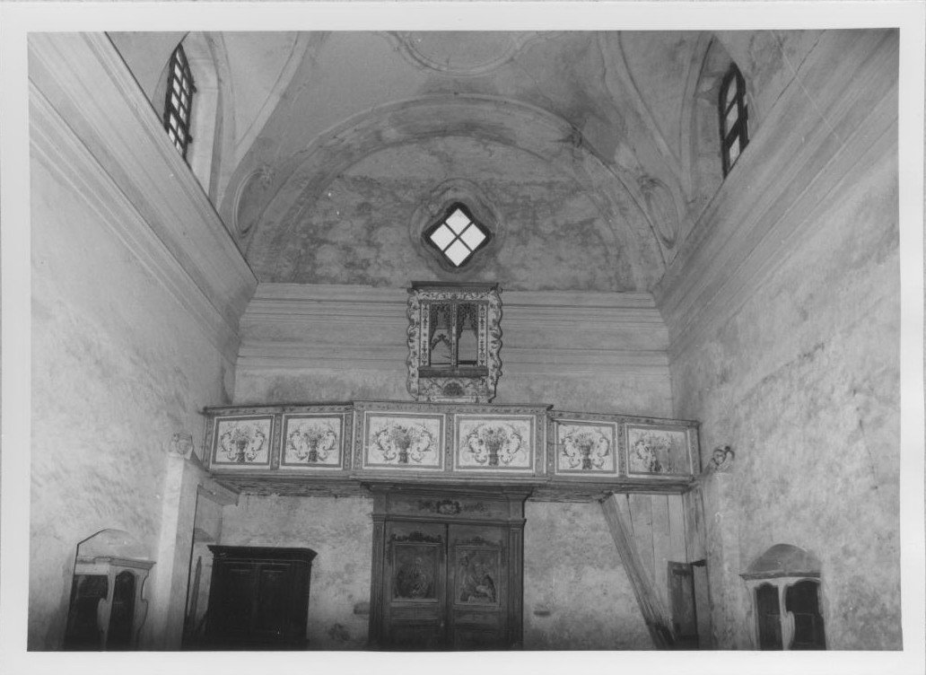 Il palco di cantoria si sviluppa sull'avanporta, per tutta l'ampiezza dell 'unica navata della chiesa. Il prospetto si articola in sei scomparti rett angolari, dei quali i due centrali più grandi e più sporgenti. Su ogni pan nello si ripete lo stesso motivo a grottesche ed esplodono decorazioni flo reali e vegetali a volute affrontate