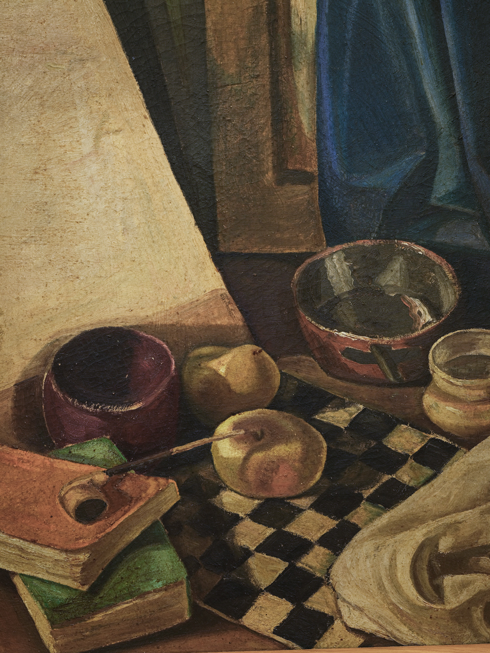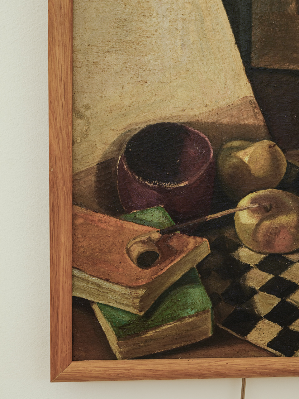 Appoggiate su di un tavolo sono ritratte una scacchiera, una tela dipinta di scorcio, della frutta, dei libri su cui è poggiata una pipa, un panno chiaro mentre in alto a destra è dipinto il lembo di una tenda scura e ancora un pentolino ed un vasetto. I colori sono scuri, le pennellate dense e le linee nette e precise