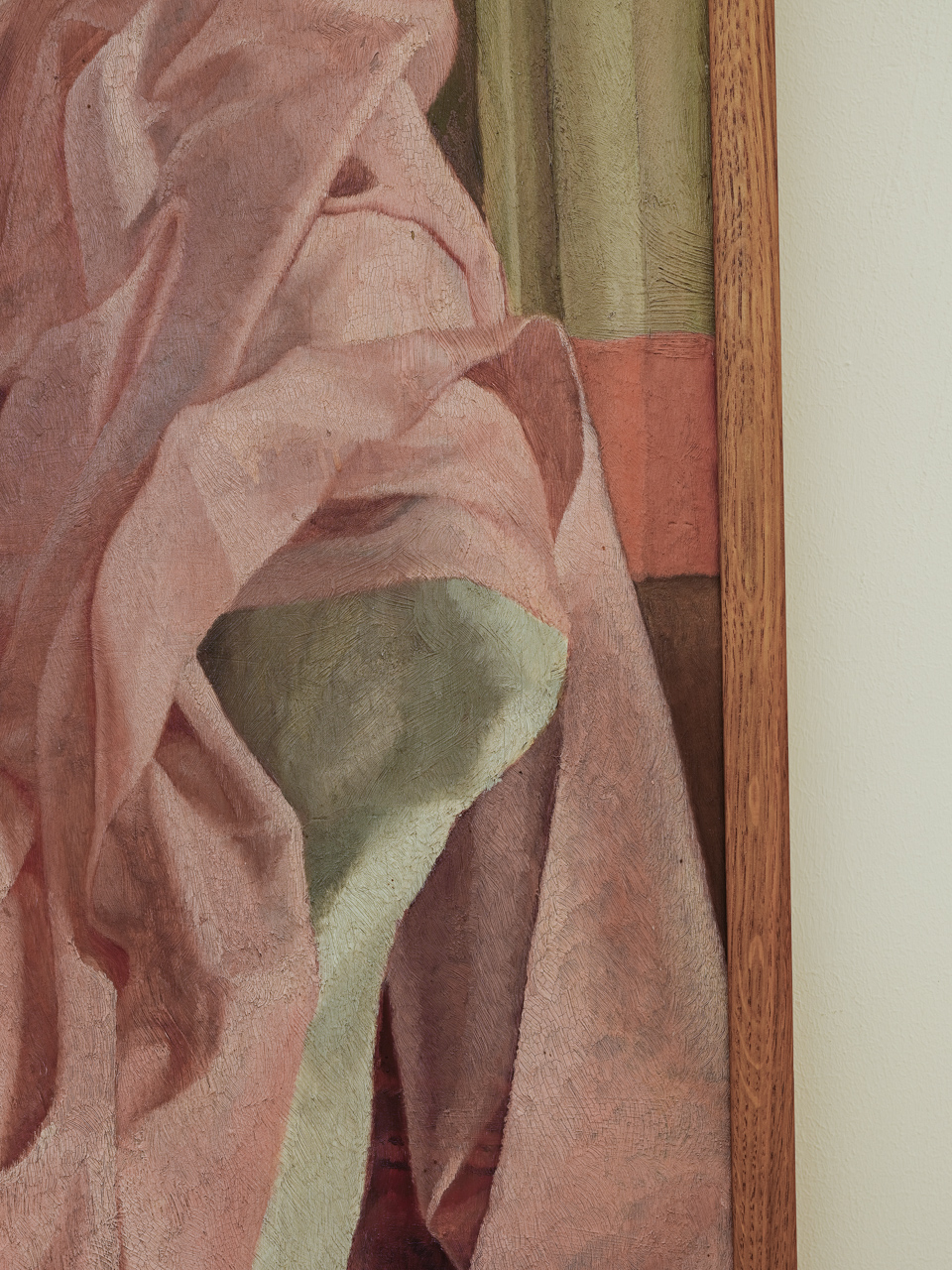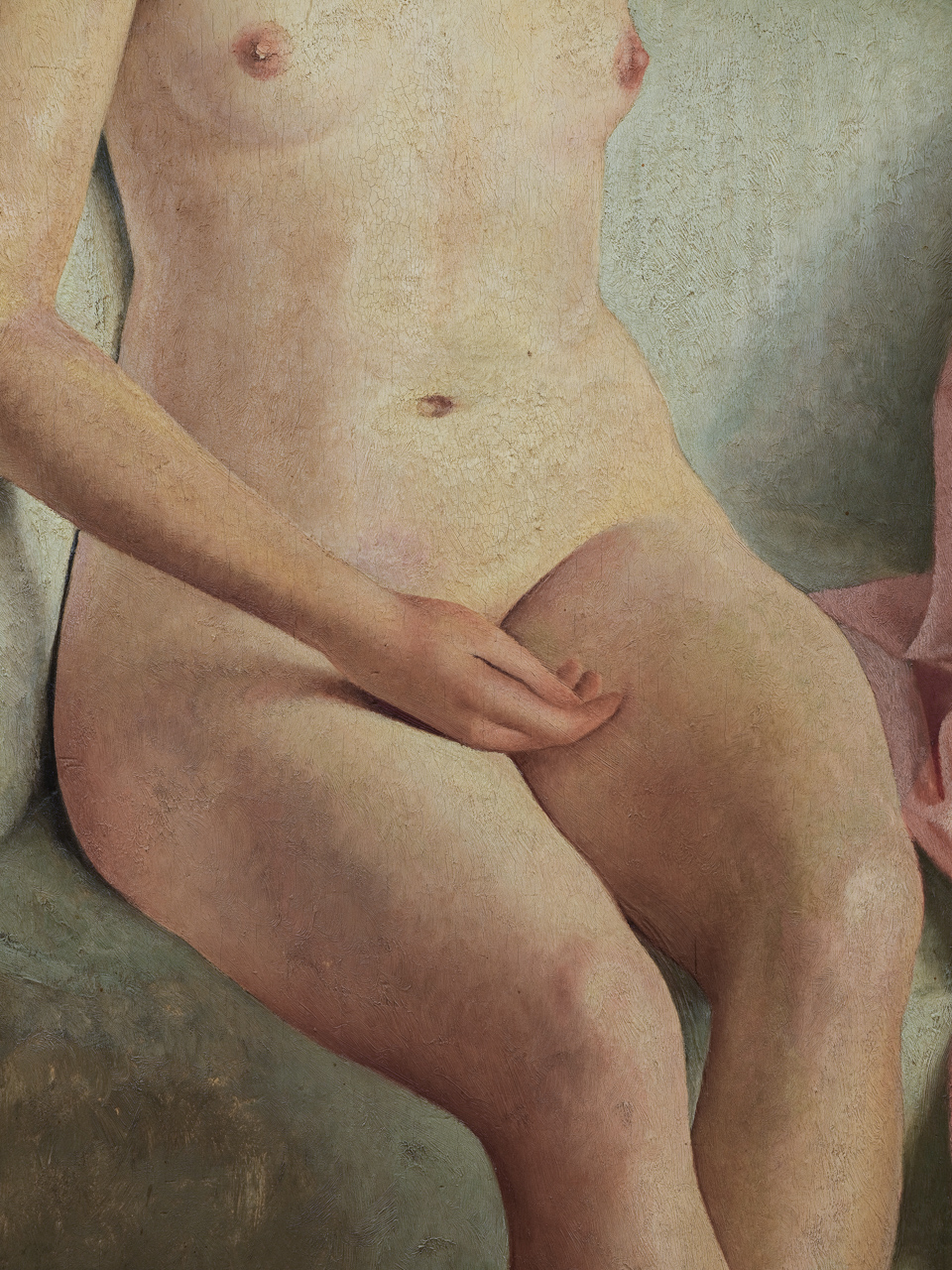 In un interno borghese che non ha più nulla del simbolismo casoratiano e conferisce all'immagine una grazia acerba e quasi ingenua, è ritratta una giovane donna nuda. Candida è seduta su di una poltrona poggiando il capo sulla mano sinistra mentre pudicamente copre le sue nudità con la mano destra