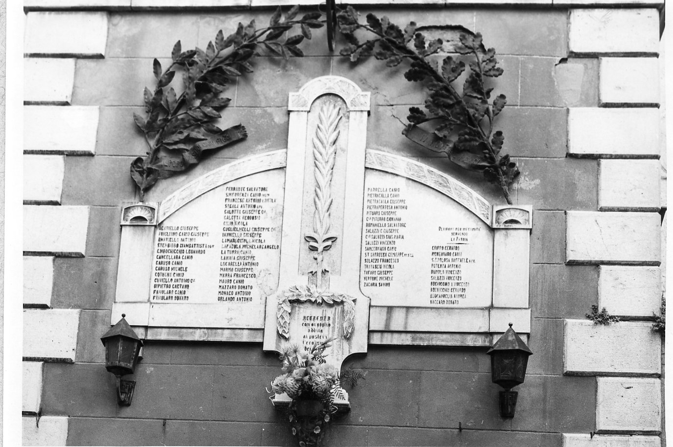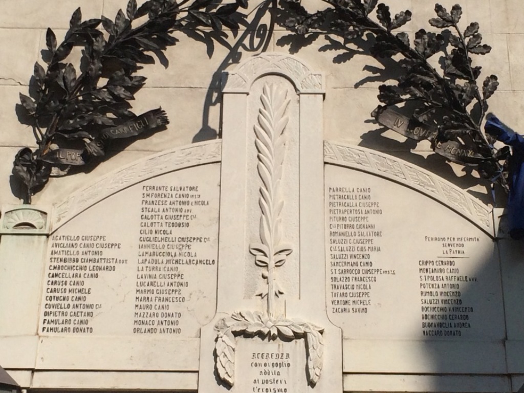- ISCRIZIONI lato sinistro - AGATIELLO GIUSEPPE, AVIGLIANO CANIO GIUSEPPE, AMATIELLO ANTONIO, S.TEN. BIBBIO GIAMBATTISTA DOTT., C.M. BOCHICCHIO LEONARDO, CANCELLARA CANIO, CARUSO CANIO, CARUSO MICHELE, COTUGNO CANIO, CUVIELLO ANTONIO, C.LE DIPIETRO GAETANO, FAMURALO CANIO, FAMURALO DONATO, FERRANTE SALVATORE, S.M. FORENZA CANIO INS.TE, FRANZESE ANTONIO E NICOLA, S.T.GALA ANTONIO AVV., GALLOTTA GIUSEPPE C.LE, GALLOTTA TEODOSIO, GILIO NICOLA, GUGLIELMELLI GIUSEPPE C.LE, IANNIELLO GIUSEPPE, LAMARUCCIOLA NICOLA, LAPADULA MICHELARCANGELO, LA TURRA CANIO, LAVINIA GIUSEPPE, LUCARELLI ANTONIO, MARMO GIUSEPPE, MARRA FRANCESCO, MAZZARO DONATO, MONACO ANTONIO, ORLANDO ANTONIO - corsivo - a incisione -