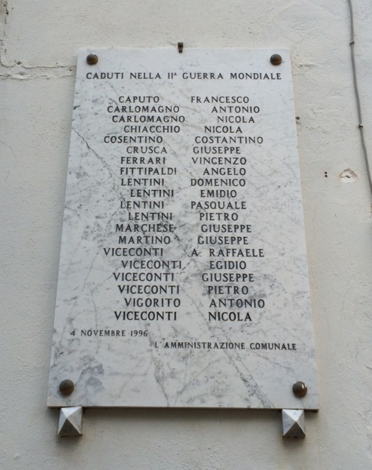 - ISCRIZIONI parte superiore - MORTI - VIGORITO FELICE, IACOVINO VINCENZO, CARLOMAGNO FRANC.NICOLA, CARLOMAGNO VINCENZO, CARLOMAGNO NICOLA ANTONIO, ANANIA FELICE, CARRANO NICOLA, LIBBOVI CARMINE, MARCHESE BIASE NICOLA, SCHETTINI GIOVANNI, ANANIA BIASE NICOLA, FLORIA GIUSEPPE, MANES FERDIANANDO - DISPERSI - MARCHESE NICOLA - GENNAIO 1921 - maiuscolo -