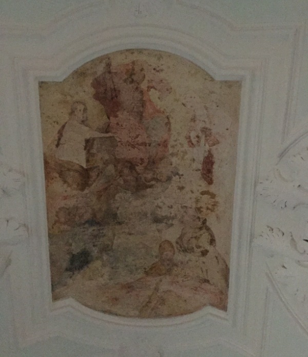 L'opera, piuttosto malconcia, mantiene intatte poche figure. Si riesce ancora a distinguere Gesù Cristo in trono con il vessillo nella mano destra, mentre la sinistra è poggiata su un globo, alle sue spalle è un drappo rosso scuro. San Giovanni e la Madonna ai lati. Nella parte inferiore si può ancora intravedere la figura di un Santo vescovo