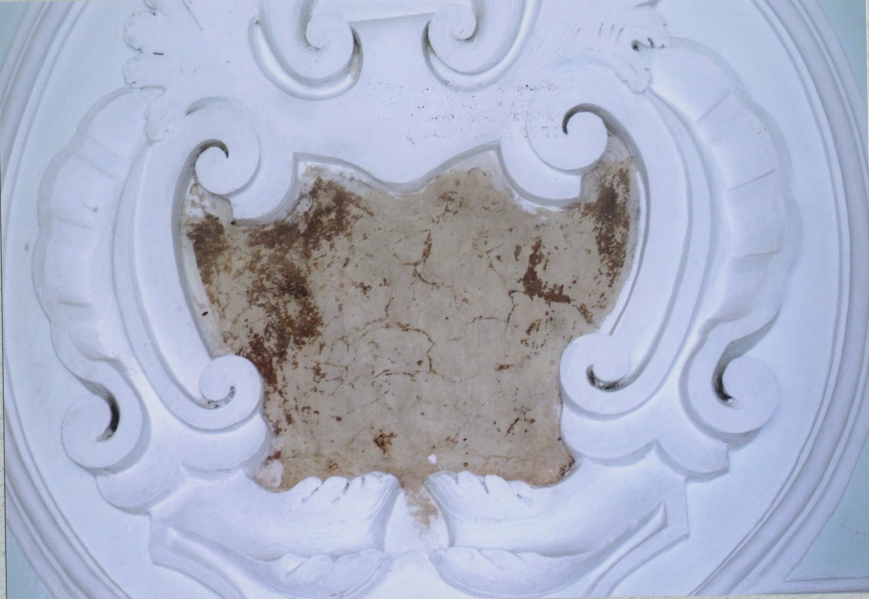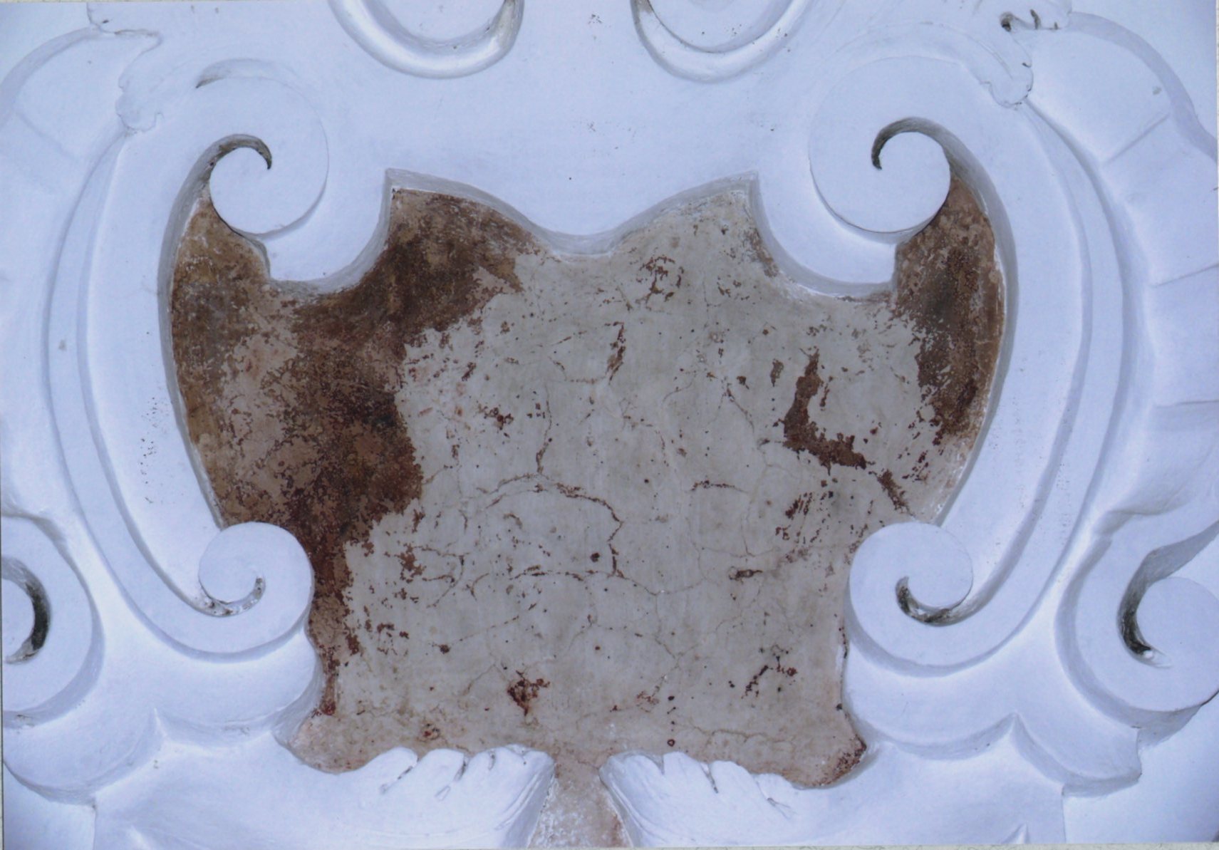 L'opera è circondata da una cornice curvilinea realizzata in stucco bianco e caratterizzata da ornamenti vegetali e decori a volute. Il dipinto è malridotto, a malapena si riescono a distinguere un paio di figure rappresentanti le anime del Purgatorio