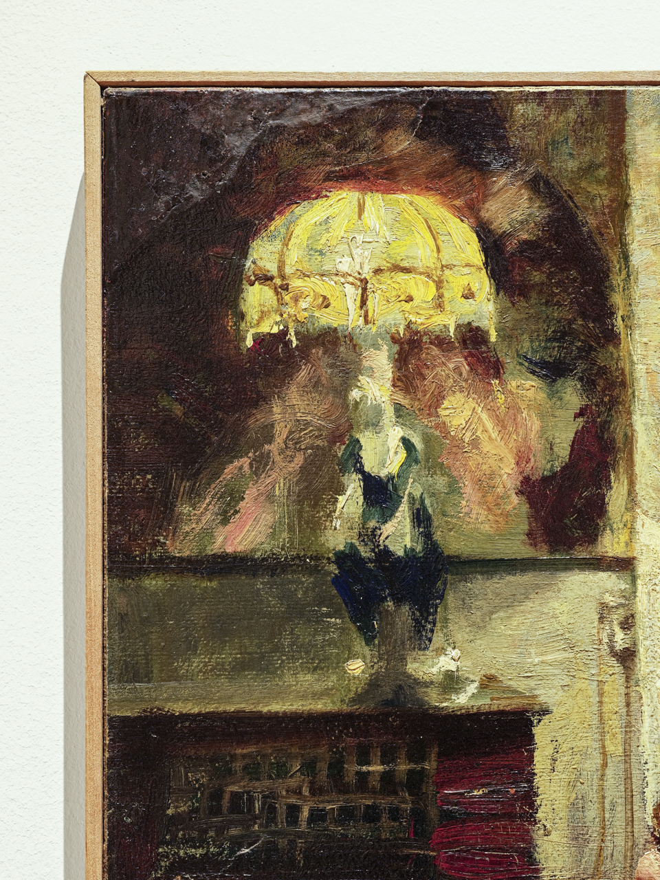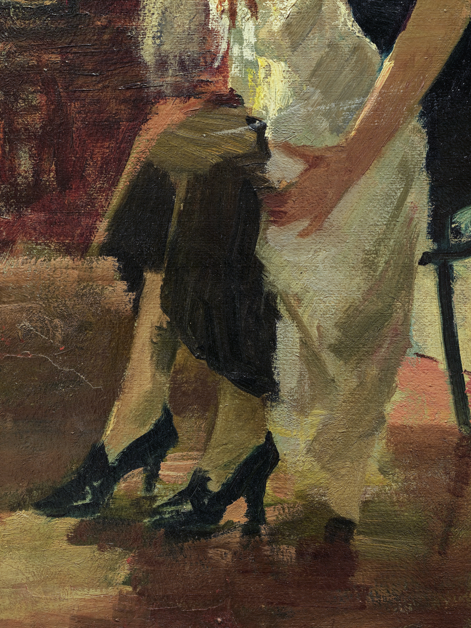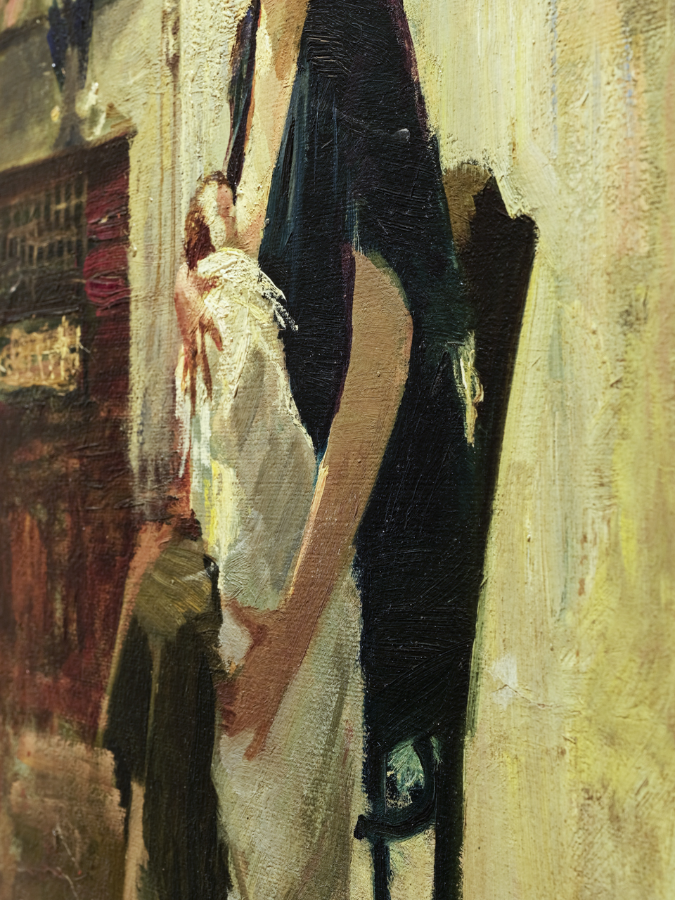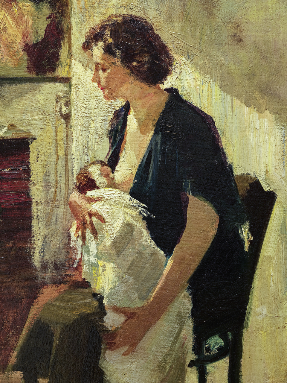 - NOTIZIE STORICO CRITICHE Protagonista di questa tela è una madre che allatta il suo figliolo nell’intimità di un angolo della sua casa appena rischiarato dalla luce di una lampada da tavolo. La poetica degli affetti familiari torna ad essere preponderante. Si tratta di una seconda versione dell’opera con cui Brando rispose al tema concorsuale dettato da Gerardo Dottori per la prima edizione del Premio Cremona nel 1939. L’opera era stata presentata alla mostra con il titolo Mentre tutto il popolo è in adunata sulle piazze d’Italia, una madre ascolta il discorso del Duce (cfr. L. Malvano, Fascismo e politica dell’immagine, Bollati Boringhieri, Torino 1988, p. 61). Oltre ad Ascoltando la radio, del soggetto è nota un’ulteriore versione, esposta alla Galleria Mandriota di Roma nel 1943, che presenta le medesime poche varianti rispetto alla prima, ovvero l’eliminazione del calendario a muro con l’effigie di Mussolini e la data del 2 ottobre (si veda I. Valente, Nel solco dell’eredità dell’impressionismo: la “poesia pittorica” di Angelo Brando, in M. Saponaro (a cura di), Angelo Brando. Opere scelte 1895-1946. Proposte per un museo, Bari, Gelsorosso, 2007, pp. 35-36)