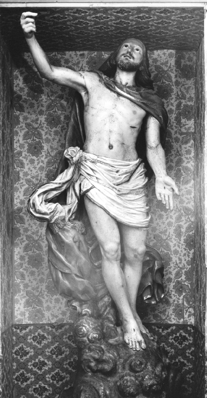 Statua scolpita a tutto tondo raffigurante Cristo risorto dipinto al naturale. Mantello rosso e drappo bianco