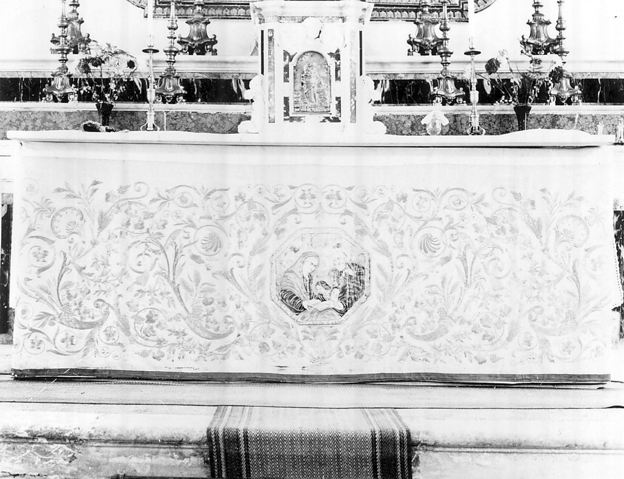 Paliotto in seta laminata d'argento e ricamato in seta e oro a motivi di cornucopie con fiori, spighe, tralci d'uva. Sono raffigurati entro un ottagono S. Anna, S. Gioacchino e Maria