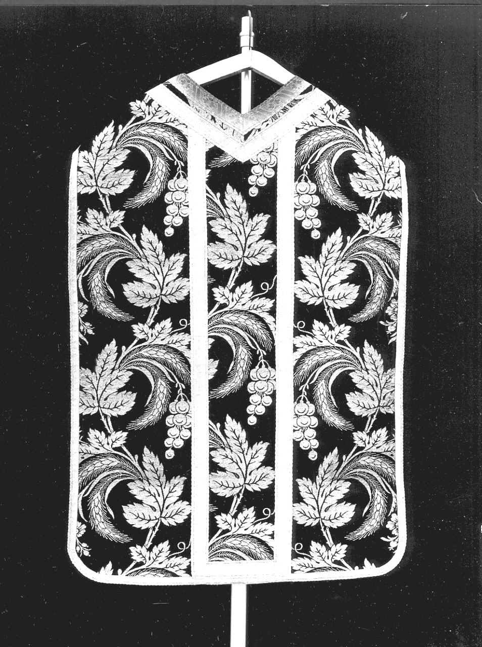 Pianeta completa di accessori in raso di seta nero operato a damasco con motivi di spighe e tralci d'uva. Gallone a filo d'oro