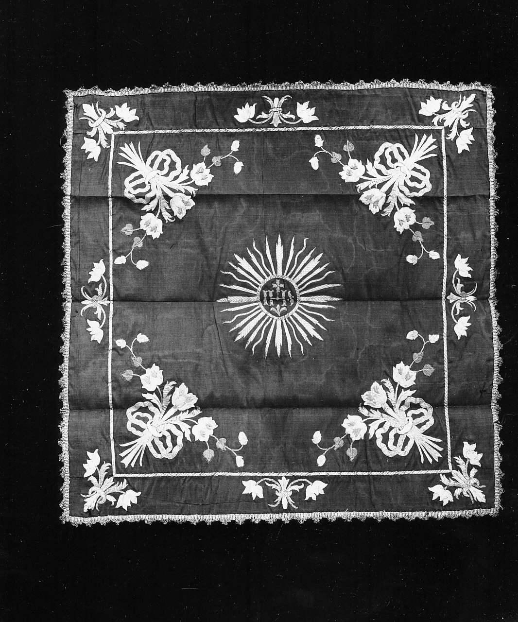 Velo di calice di seta "moirè" verde con ricami di mazzi di fiori in filo di seta policromo misto a filo d'oro. Al centro è ricamato il monogramma della Trinità