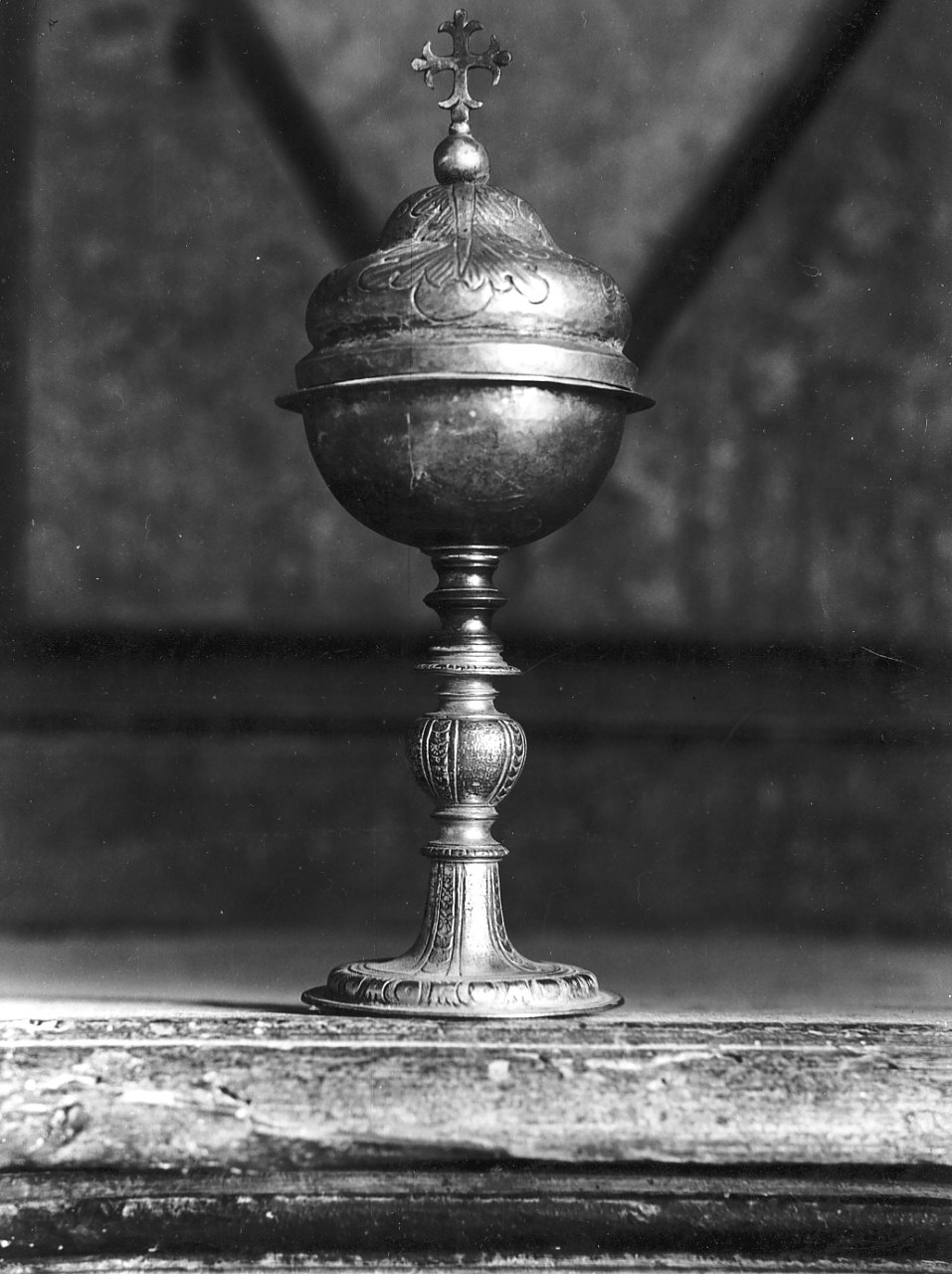 Pisside in rame battuto e dorato con decorazione di motivi vegetali incisa a mano sulla base e sulla coppa. Base e fusto decorati con ovuli e modanature a rilievo