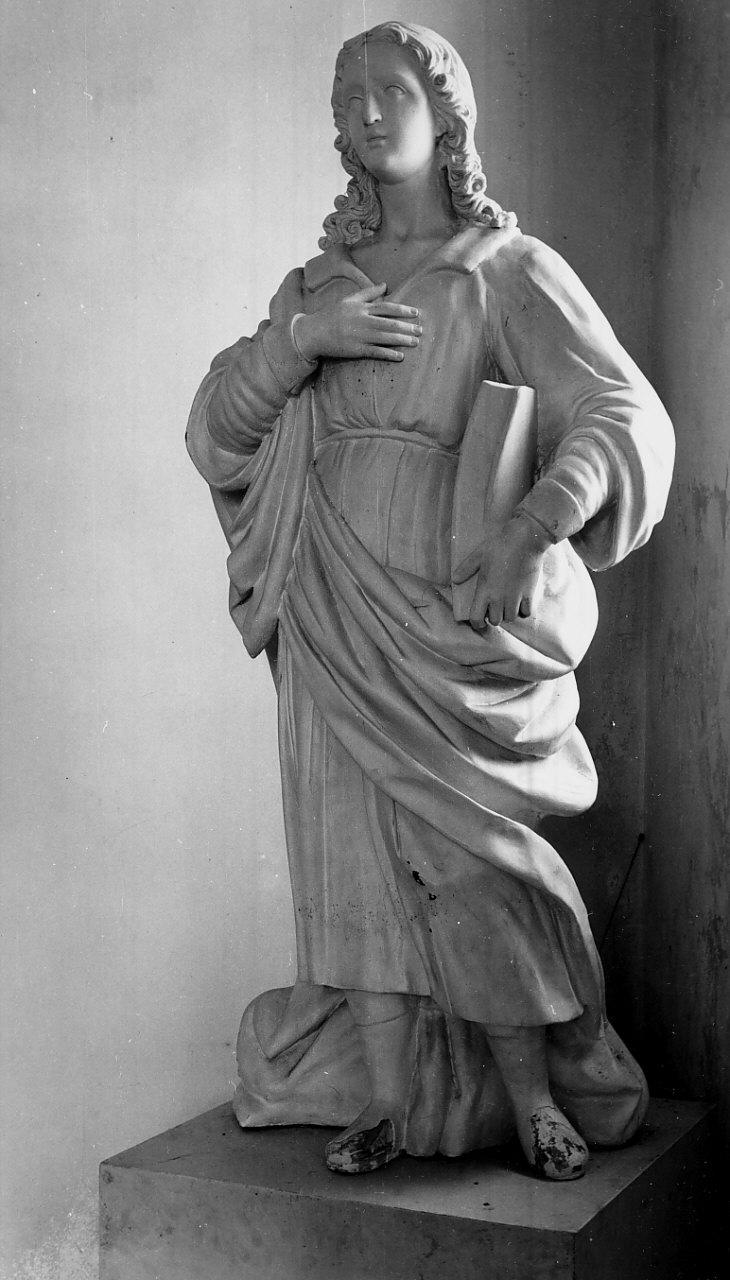 Statua scolpite in legno a tutto tondo raffigurante S. Cosma. In origine dipinta al naturale, la statua è stata recentemente intonacata e trasferita dalla collocazione originaria, al lato dell'altare maggiore, in sacrestia