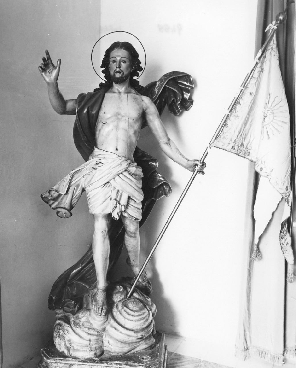 Statua lignea scolpita a tutto tondo e dipinta al naturale, raffiguarnte Cristo risorto su nuvole, con stendardo di seta bianca a ricami in oro nella mano destra. Policromia originaria: manto roso con bordo damascato in oro, perizoma bianco con bordo d'oro