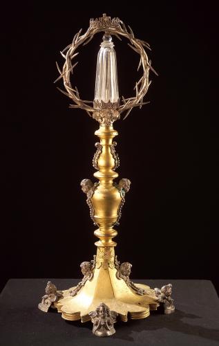 Reliquiario in rame dorato, con base polilobata e fusto a doppio "vaso", decorati con cherubini fusi in argento ed applicati ai quattro piedini di base, sul fusto e alla base della teca. Teca a campana in cristallo di rocca, circondata da corona di spine in argento fuso e sormontato da corona in filigrana d'argento