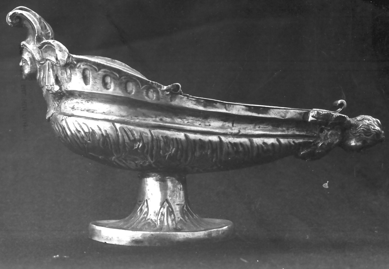 Navicella in argento lavorato a fusione e a cesello: poggia su un piede ovale decorato a foglie lanceolate e reca a prua una testa di cherubino e a poppa un mascherone tra volute e panneggi