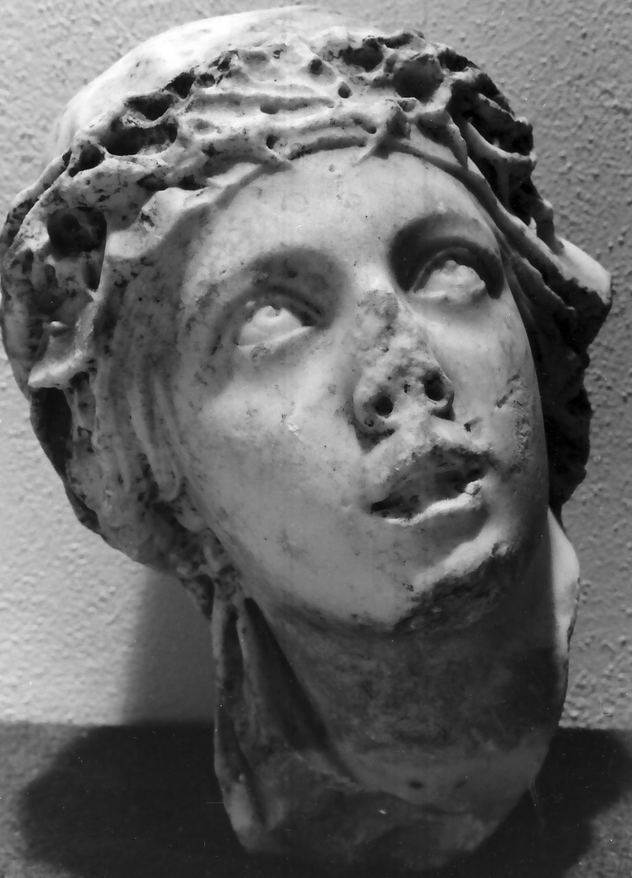 Scolpita a tutto tondo, la testa è coperta da un velo di cui sono ben visibili le pieghe. Gli occhi rivolti al cielo sono scolpiti sin nei minimi particolari mentre la bocca appare aperta in atteggiamento estatico. Nonosatnte in più parti rotta, il viso ben modellato nell'ovale ha degli interessanti effetti chiaroscurali ottenuti da lievi ma efficaci caratterizzazioni: appena segnati i solchi palpebrali e nasolabiali. Secondo la corrente iconografia la Santa è raffigurate coronata di spine