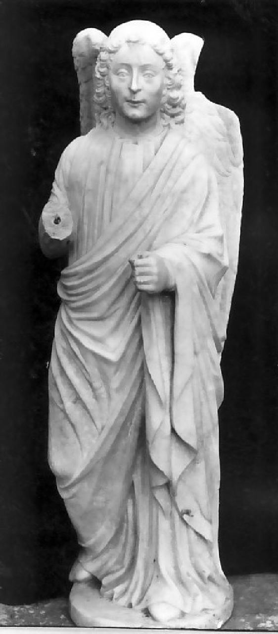 Scultura a tutto tondo raffigurante l'Arcengelo Gabriele avvolto in morbido panneggio con il volto incorniciato da capelli ondulati e con lunghi ali raccolte; manca dell'avambraccio destro