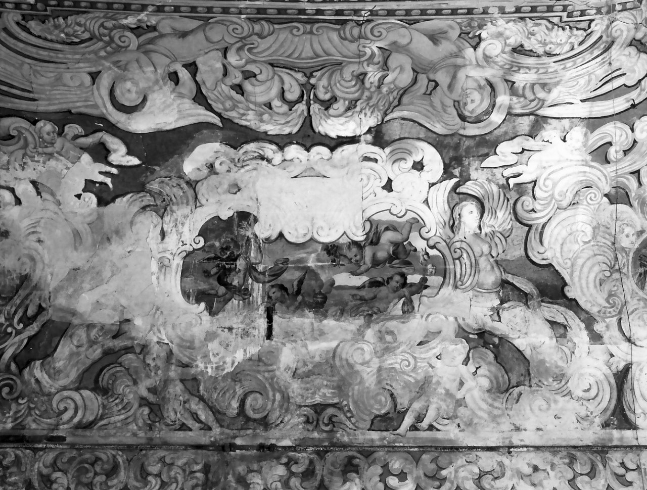 In una cornice barocca, delimitata da un succedersi di volute movimentatee rotondeggianti, si muovono svolazzando un gruppo di quattro putti alati