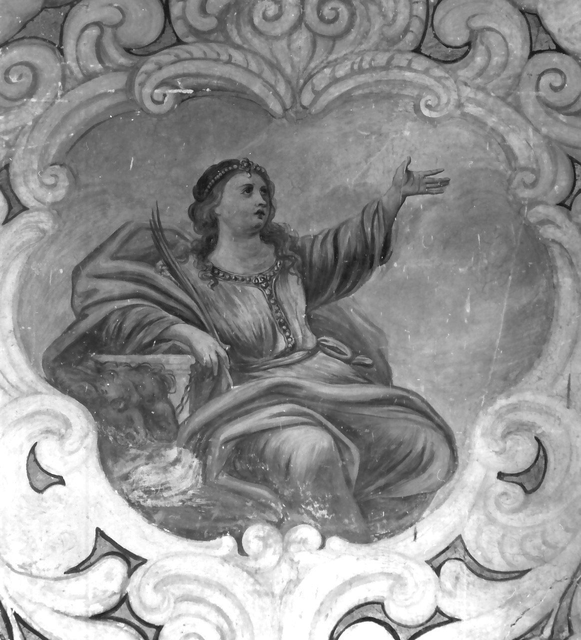 S. Domenica è raffigurata seduta, con la destra regge la palma e tiene innalzata la sinistra. Ha lo sguardo teso in avanti verso l'alto. E' avvolta in un ampio paludamento e sulle spallle scende la chioma