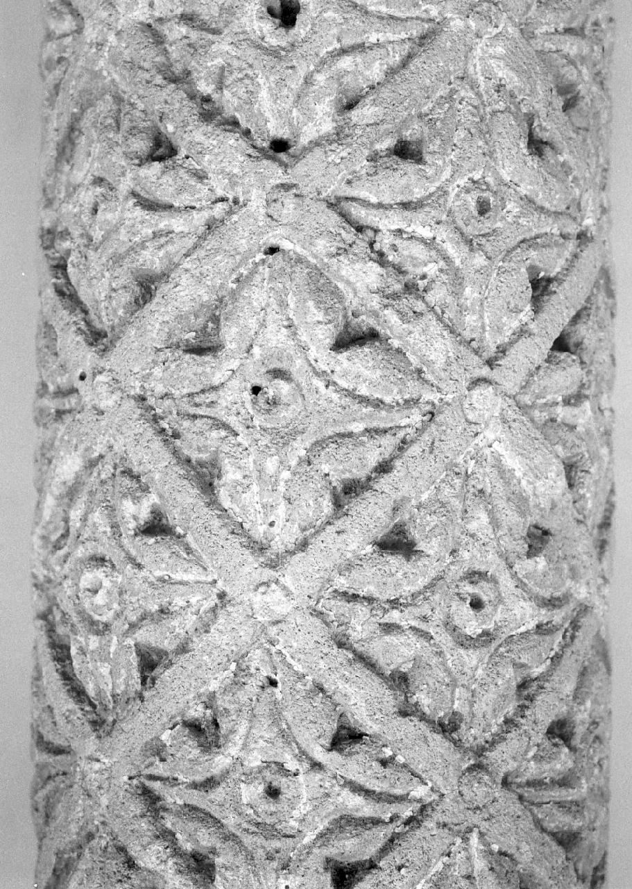 La decorazione del fusto consta di un reticolato a maglie romboidali raccordate da un bottone. All'interno di ogni maglia è scolpito un fiore quadripetalo