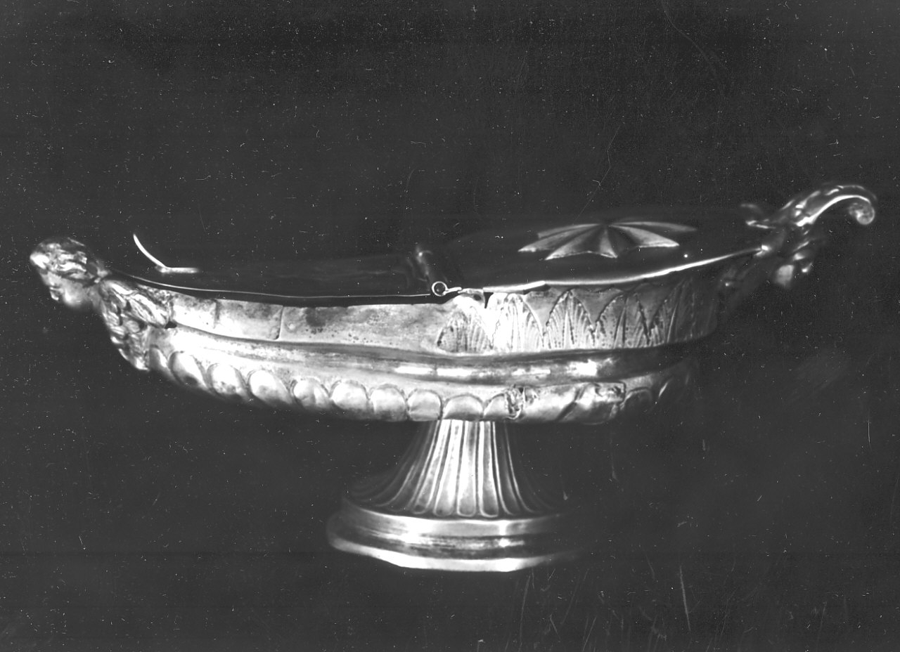 - NOTIZIE STORICO CRITICHE La navicella di discreta fattura è opera di un artista, di cui conosciamo il marchio, ma dal quale non è stato possibile risalire al nome, tale marchio tra l'altro, non fa parte di quelli conosciuti e pubblicati; che tale argentiere sia napoletano lo si deduce dal bollo di riscontro con la testina di Partenope vista di faccia e dal numero cinque, corrispondente al titolo di piazza. Tale bollo entra in vigore a partire dal 1808 e permane fino al 1824, quando sarà sostituito da un altro nel quale la Partenope è vista di profilo (Catello E. e C., 1973, pp. 82-83). La navicella va, dunque, datata entro quell'intervallo di tempo