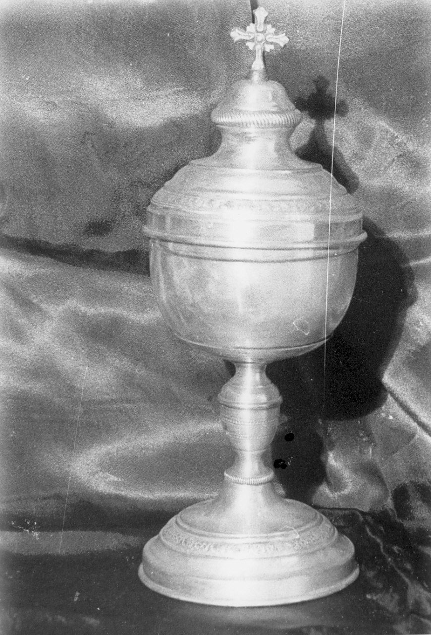 - NOTIZIE STORICO CRITICHE Di non pregevole fattura, la pisside non offre molti elementi per una chiara determinazione dell'ambito in cui è stata realizzata e dell'anno in cui ciò è accaduto. Tuttavia, proprio la semplicità decorativa e la mancanza di punzoni, fanno propendere per una datazione alla fine del XIX secolo, quando si fa strada, anche nella produzione di tessuti, una tendenza di gusto aniconica, ed i marchi dell'argenteria diventano facoltativi