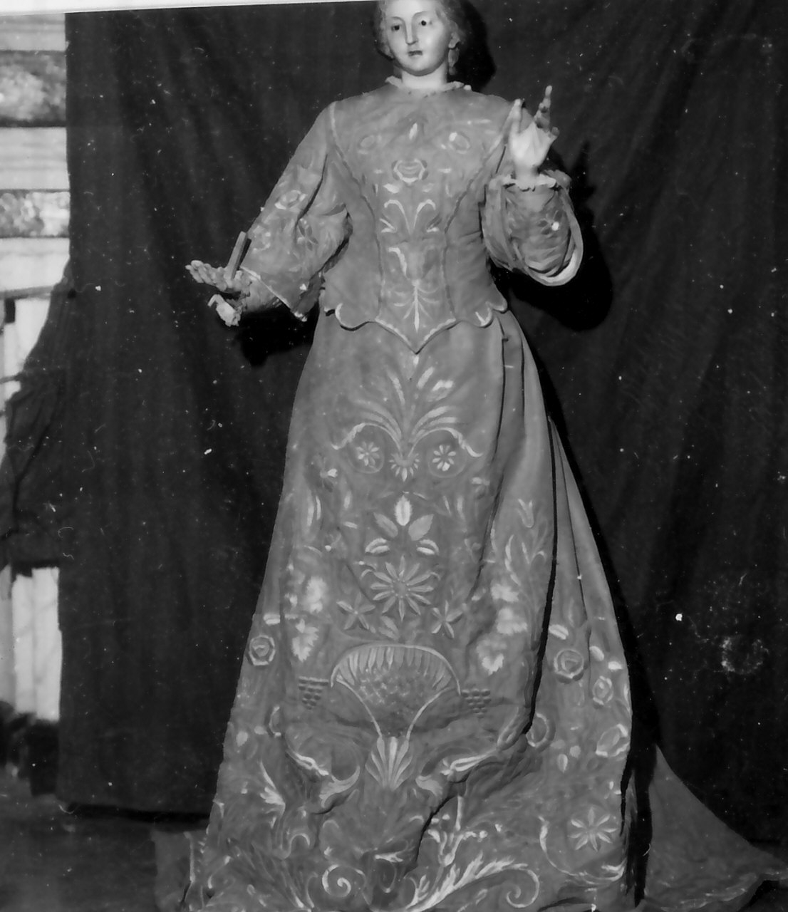 Si compone da sei pezzi indipendenti: le maniche, i polsi, un corpetto, una gonna. Il complesso ricamo in oro, a punto pieno, rete e ombra, è concepito come un trionfo di fiori diversi chiusi in alto da un mazzo di spighe. E' complementare all'analoga veste del Bambino