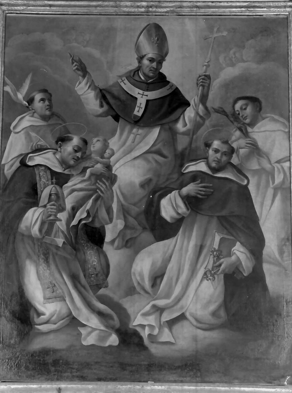 Personaggi: San Giacinto di Polonia; San Vincenzo Ferrer. Attributi: (S. Giacinto di Polonia) abito domenicano; statua della Madonna con il Bambino; ostensorio. Attributi: (S. Vincenzo Ferrer ) abiti domenicani; libro; chiavi. Figure: Santo Vescovo; Santi Domenicani