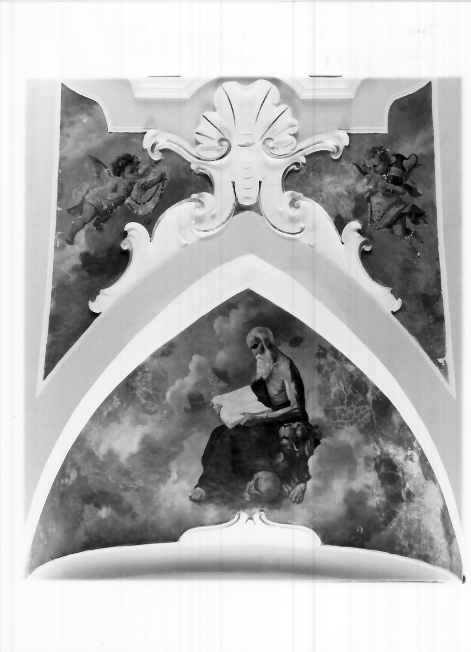 In alto ai lati sono raffigurati due angioletti recanti simboli sacri: un rosario e una brocca