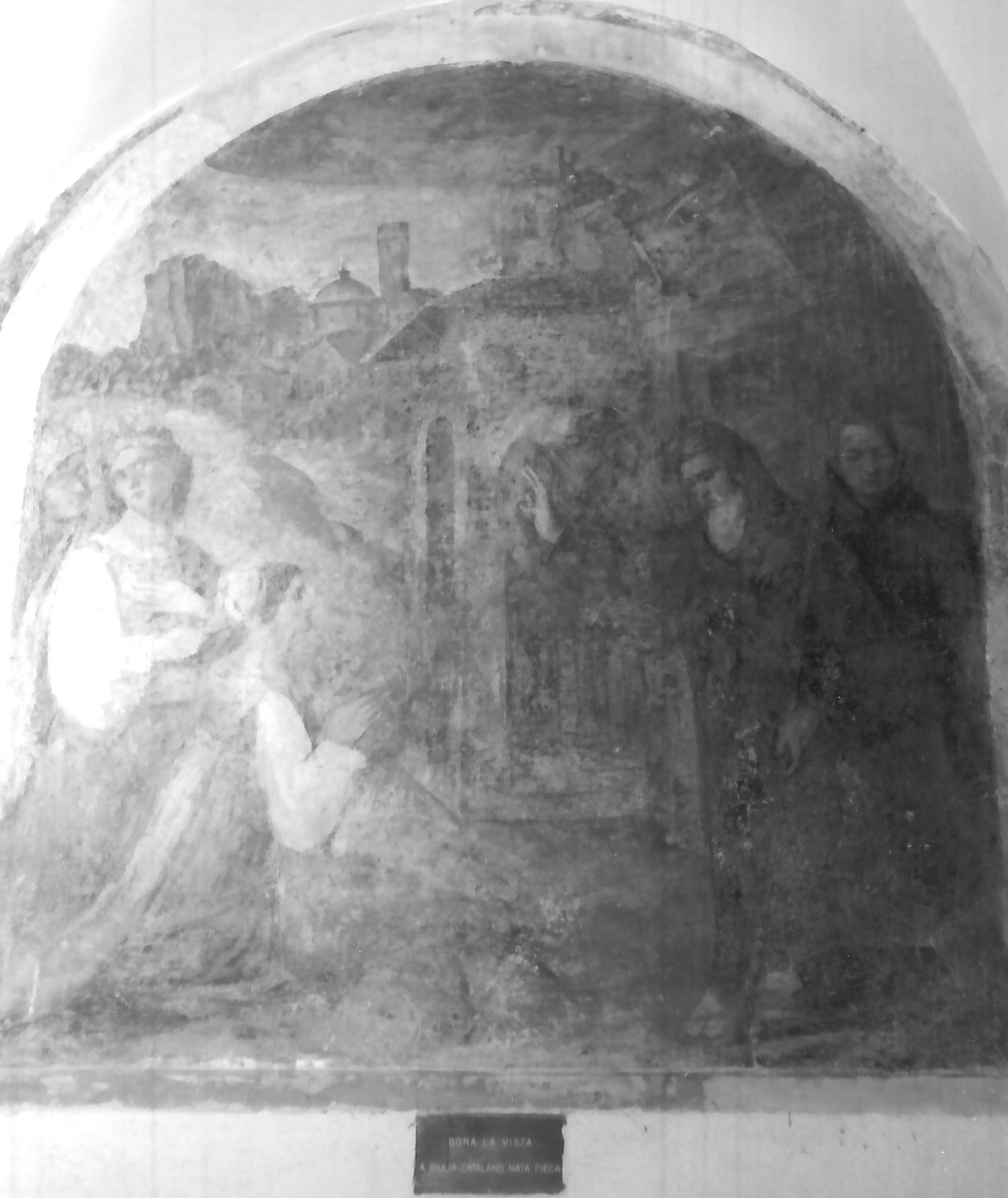 L'affresco raffigura il Santo a destra con la mano alzata; mentre, una foglia cade dagli occhi di una donna a sinistra