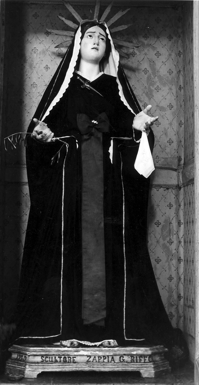 Personaggi: Madonna Addolorata. Attributi: (Madonna Addolorata) abito nero; fazzoletto; spada che trafigge il cuore
