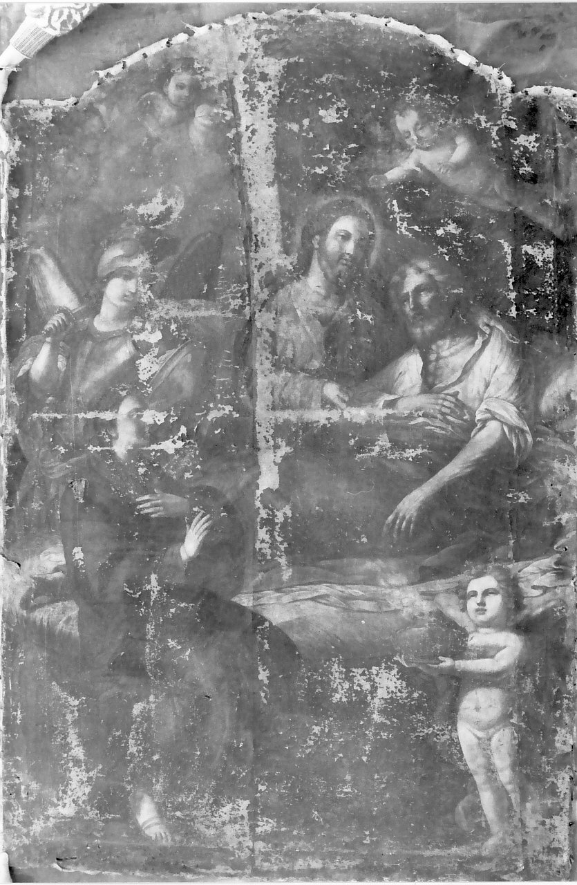S. Giuseppe morente, accanto a lui la Madonna e Gesù. S. Michele Arcangelo in veste di guerriero. Altri angeli con verga fiorita e turibolo