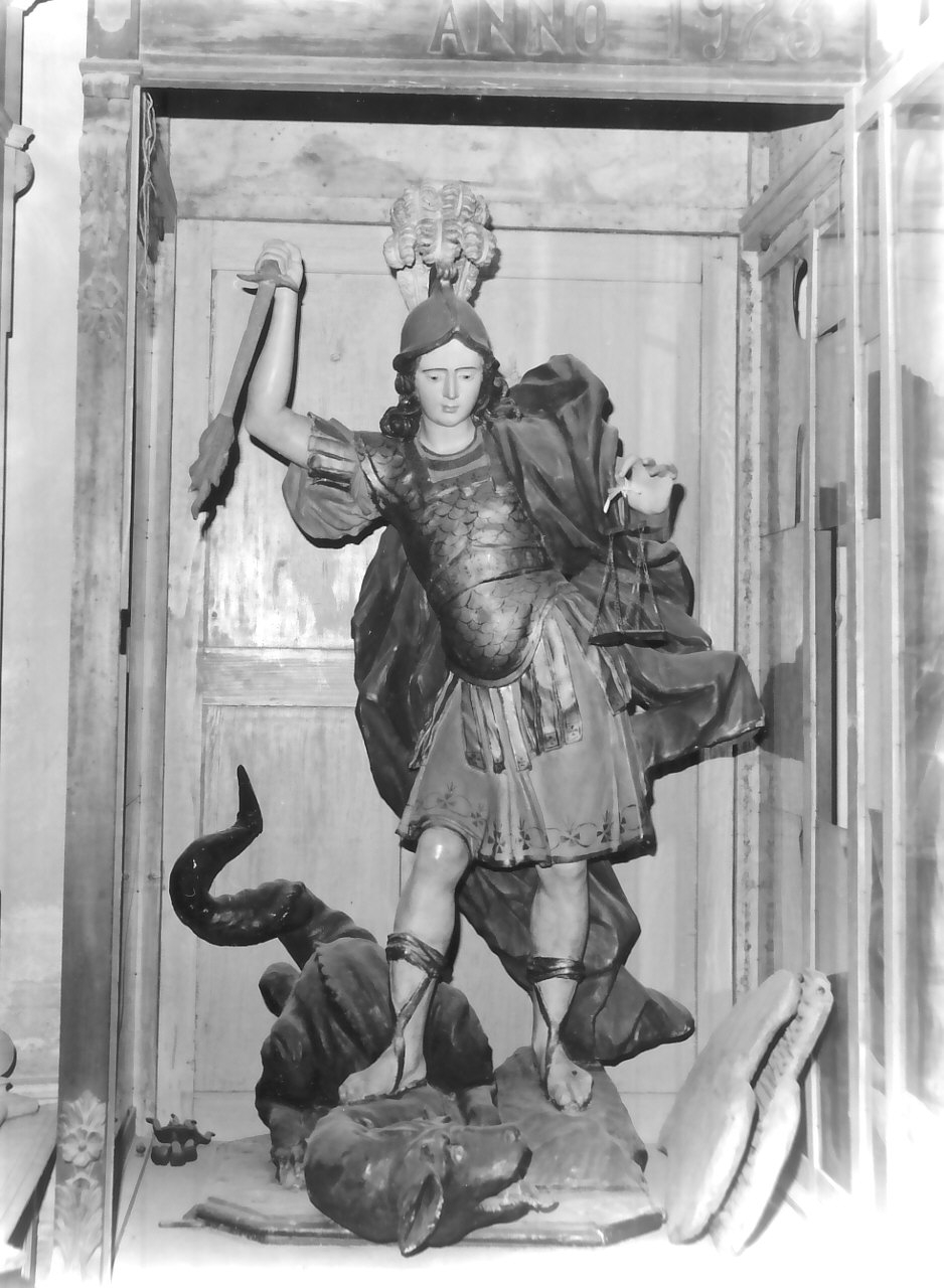 Personaggi: San Michele Arcangelo. Attributi: (San Michele Arcangelo) armatura; elmo; spada; bilancia. Figure: drago