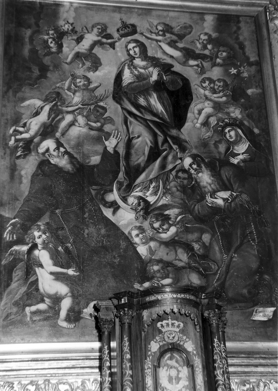 Dipinto raffigurante la Vergine in Gloria tra angeli svolazzanti e tre Santi cappuccini: S. Lorenzo da Brindisi; Bernardo da Offida e Veronica Giuliani