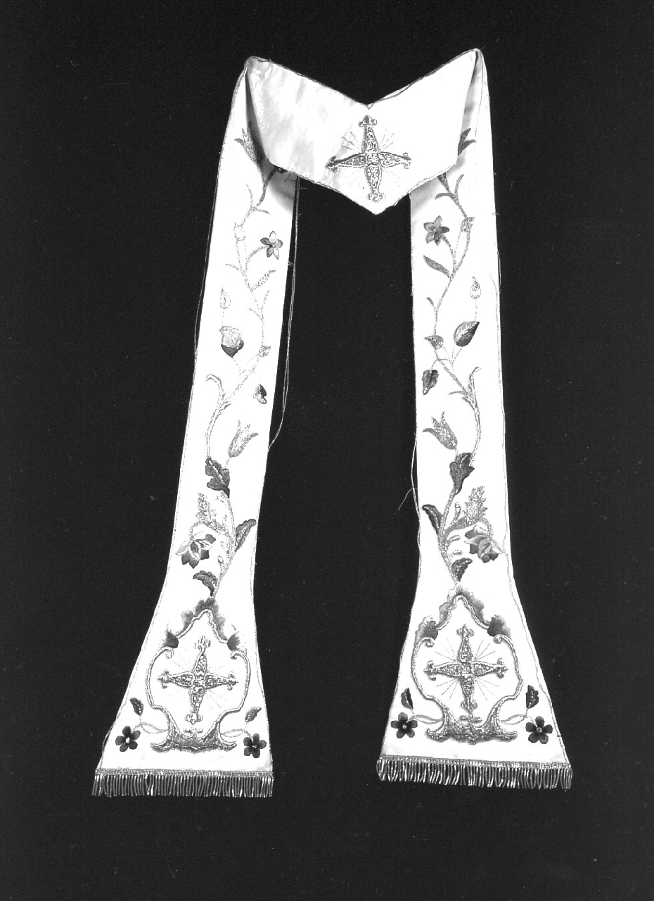 Stola. Fondo damasco, seta, color crema. Croce gallonata in fili di seta gialla. Il modulo decorativo presenta grandi fiori e foglie. Fodera non originale