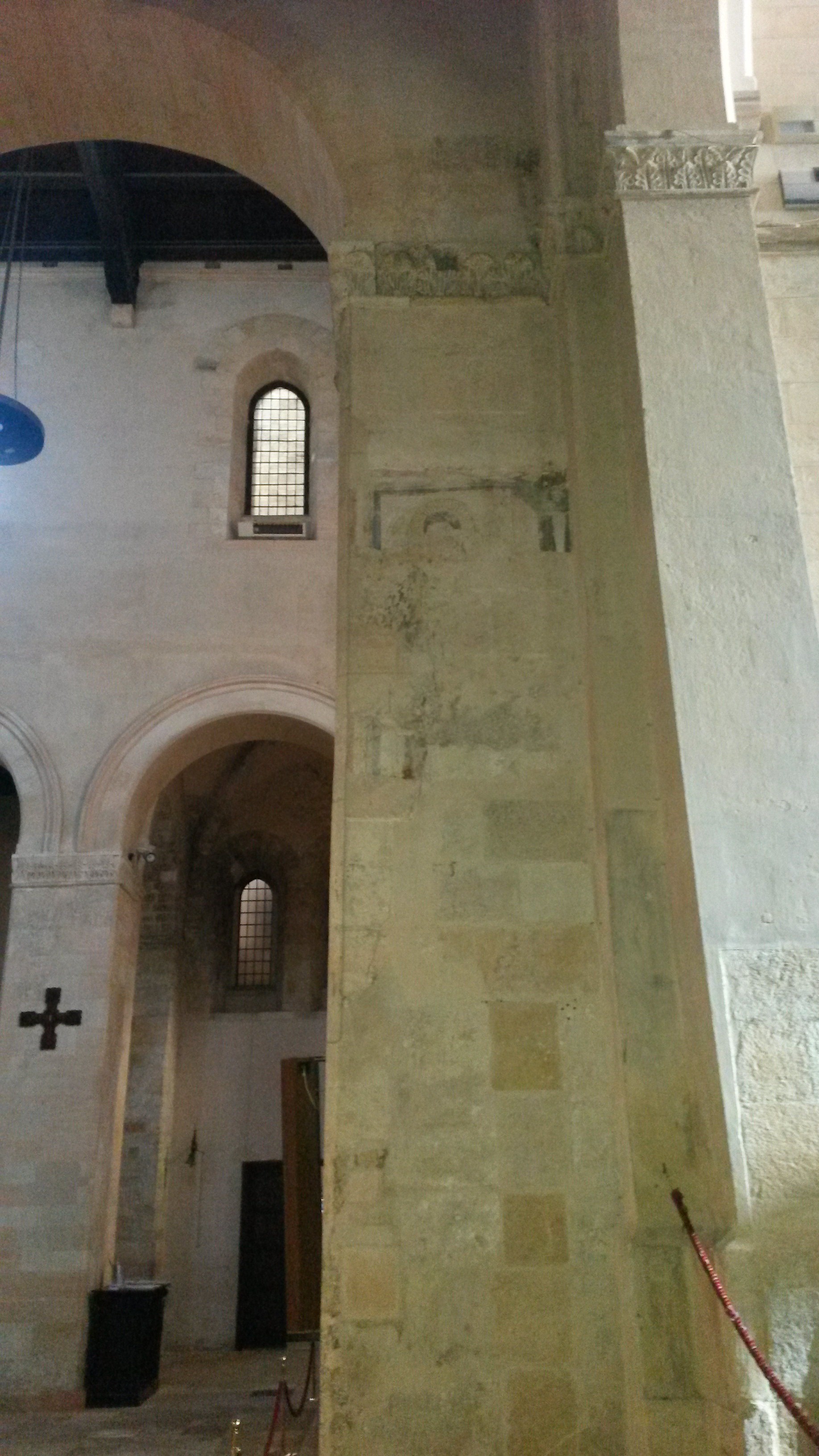 - NOTIZIE STORICO CRITICHE Durante i lavori di restauro della cattedrale nel 1934 e, precisamente, quelli di liberazione e di scavo vennero fuori frammenti dei suddetti affreschi. Si tratta di figure di Santi e porzioni di intonaco decorato a filettature bianche su fondo ocra, a finto bugnato documentanti la presenza di figurazioni e di decorazioni parietali comunemente applicate, nei tipi e nel corso dei secoli XIV - XV