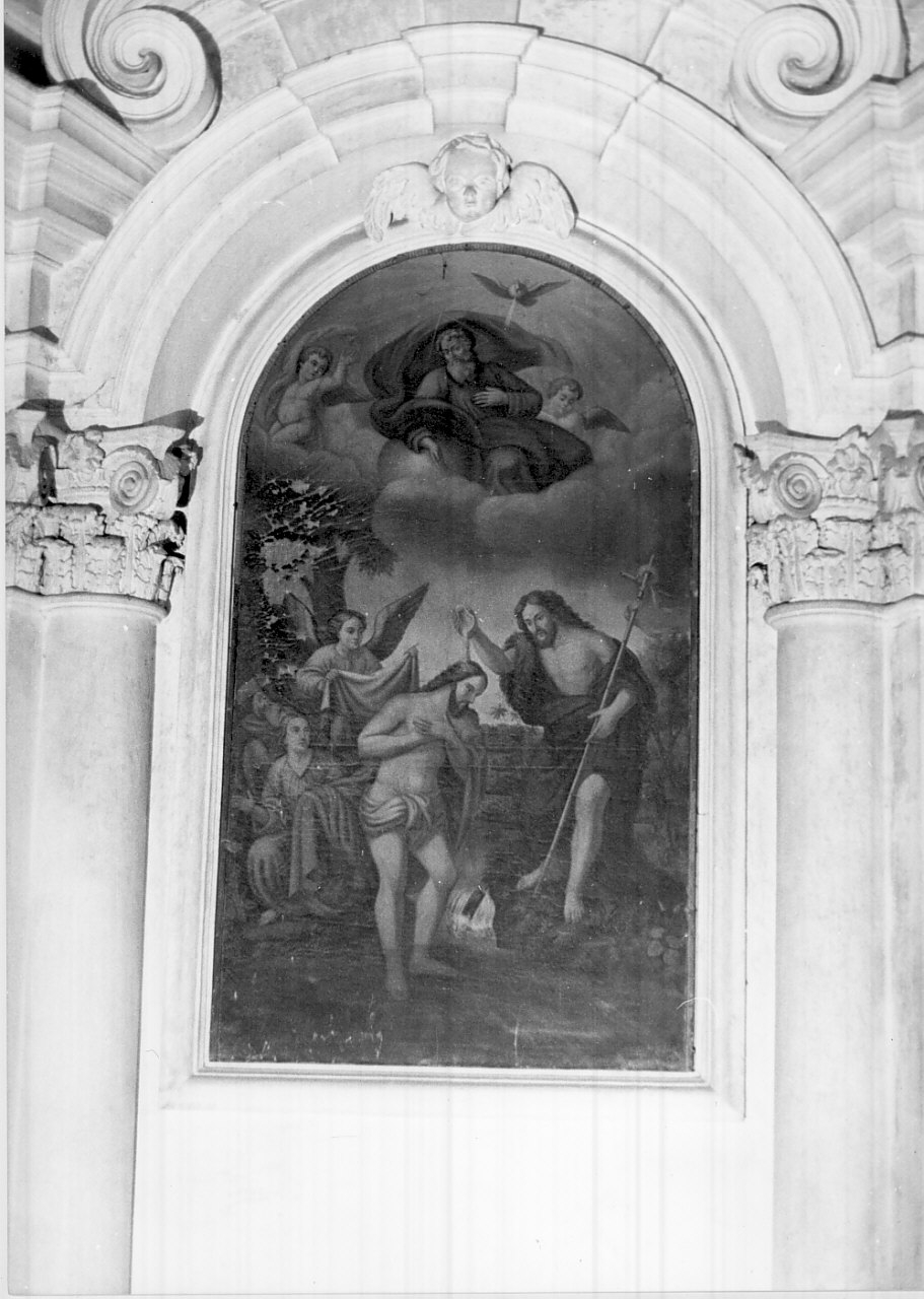 La tela raffigura il Battesimo di Cristo. S. Giovanni in posizione leggermente più alta rispetto al Cristo, è quasi chino, coperto da un mantello azzurro. Cristo, immerso con i soli piedi in acqua, è ricoperto da un perizoma bianco. Alle sue spalle un gruppo di angeli reggono drappi bianchi e rossi. Nella parte superiore campeggia la figura dell'Eterno Padre attorniato da angeli e poggiante su soffici nuvole e sul globo