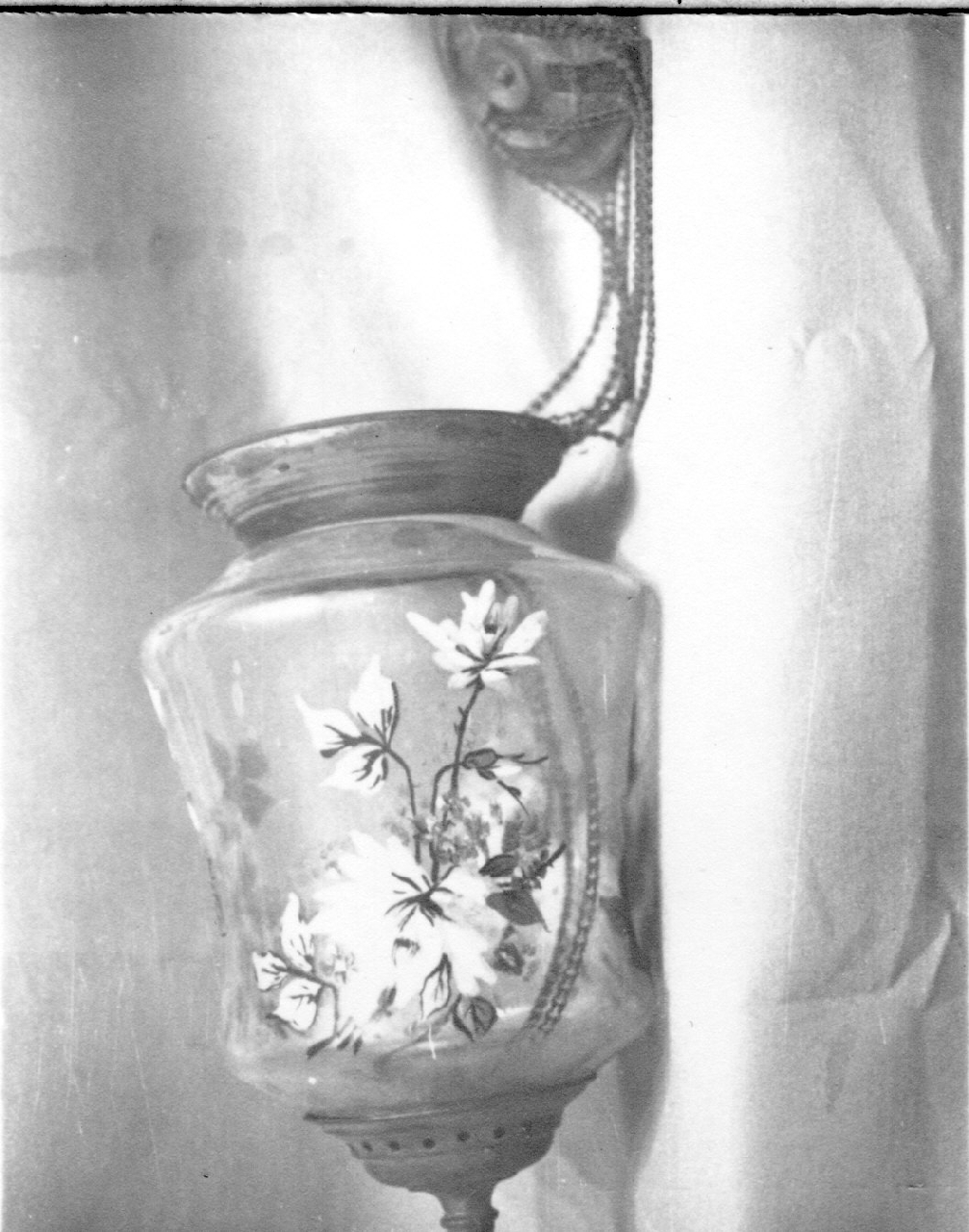 La lampada, in vetro di forma cilindrica, è bombata alla base e decorata con fiori dipinti a mano. E' chiusa in basso un coperchio di rame e, della stessa materia, sono le catenelle di sostegno