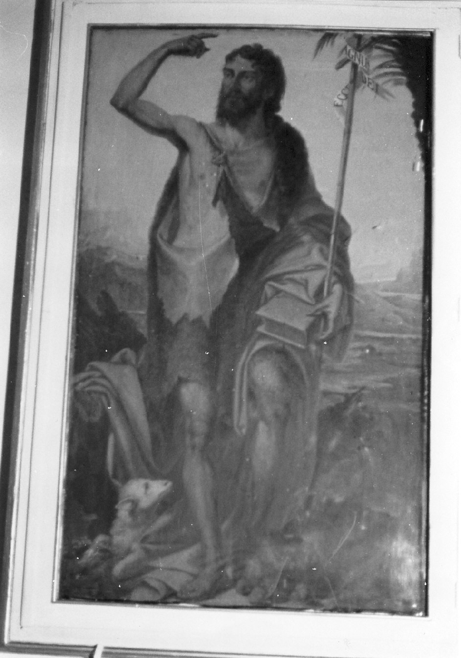 Dipinto raffigurante il Battista nel deserto coperto da una tunica e da una pelle di cammello, mentre tiene un lungo bastone a forma di croce con nastro pendente che reca la scritta "AGNUS DEI", e, appoggiato sulla gamba, il Vangelo. Ai suoi piedi, un agnello con la testa rivolta verso il Santo