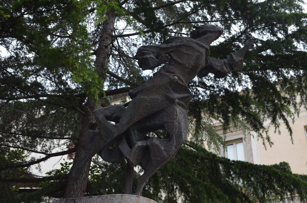 Su un'alta base modanata in granito, si erge la statua in bronzo raffigurante una figura maschile dalle linee futuriste, colta nell'atto di avanzare, sollevando un rametto di ulivo nella mano sinistra