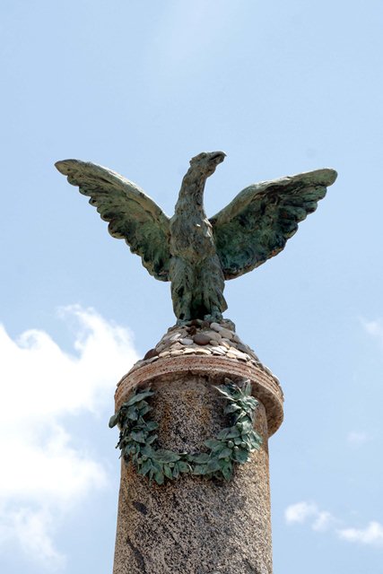 - NOTIZIE STORICO CRITICHE L’originario monumento, realizzato nel 1924, era composto da una base in marmo e dalla colonna granitica, sulla quale era posizionata un’urna con la fiamma. Nel 1936 fu eliminata l’urna e sostituita con un’Aquila in marmo, fatta realizzare da una fonderia di Napoli. La stessa aquila fu realizzata per il comune di Rocca di Neto (KR). Nel 1992, come testimonia un’iscrizione sul monumento, furono aggiunte le lapidi che ricordano i caduti durante la guerra del 1940- 1945. Il monumento ha subito nel corso dei secoli diversi rimaneggiamenti, tra cui la sostituzione delle vecchie lapidi con i nomi dei caduti durante il primo conflitto mondiale, ma conserva ancora l’originaria colonna granitica del 1924 e l’Aquila del 1936
