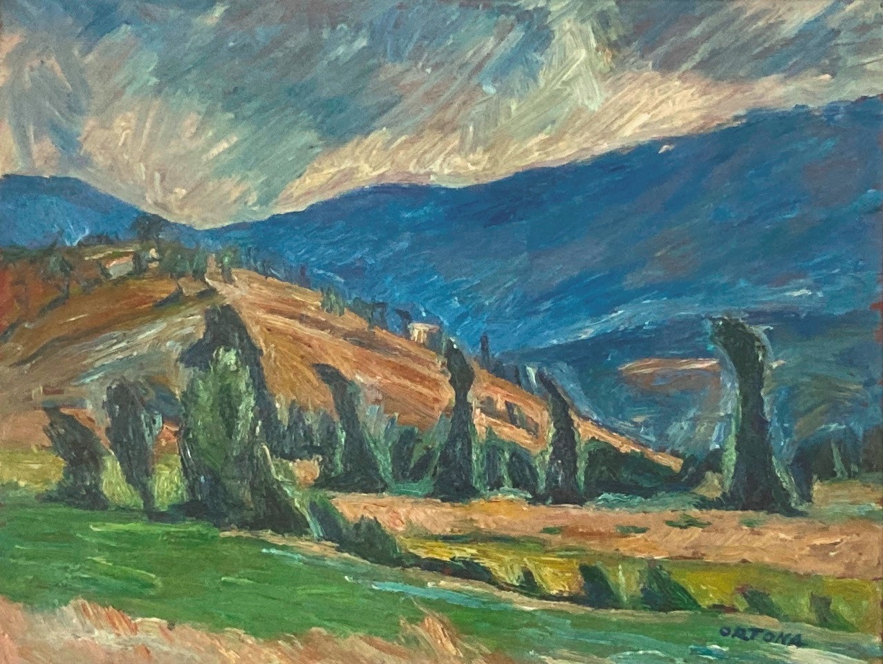 - NOTIZIE STORICO CRITICHE La rappresentazione di paesaggi collinari (vallate, uliveti o pinete) è piuttosto ricorrente nel percorso artistico di Ortona, che rimane molto affezionato alla natura incontaminata che ritrova in Calabria, nel suo paese natale, nonostante il suo trasferimento a Roma. Nel caso di questo dipinto, il paesaggio collinare con alberi e siepi come sospinti e agitati dal vento, è reso con pennellate spesse e materiche e una cromia accesa e drammatica