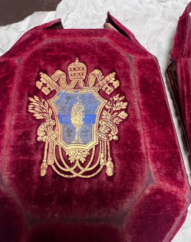- STEMMI sul coperchio della teca, al centro - pontificio - Stemma - S.P. di Gioacchino Pecci (Carpineto Romano, 02/03/1810 – Roma, 20/07/1903), Papa Leone XIII, 1878 - 1 - stemma pontificio di Gioacchino Pecci (Carpineto Romano, 2 marzo 1810 – Roma, 20 luglio 1903), eletto papa col nome di Leone XIII nel 1878