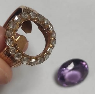 Anello in oro con incastonata un’ametista montata con cornice di diciotto diamanti