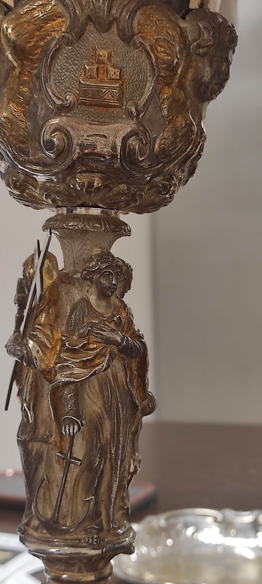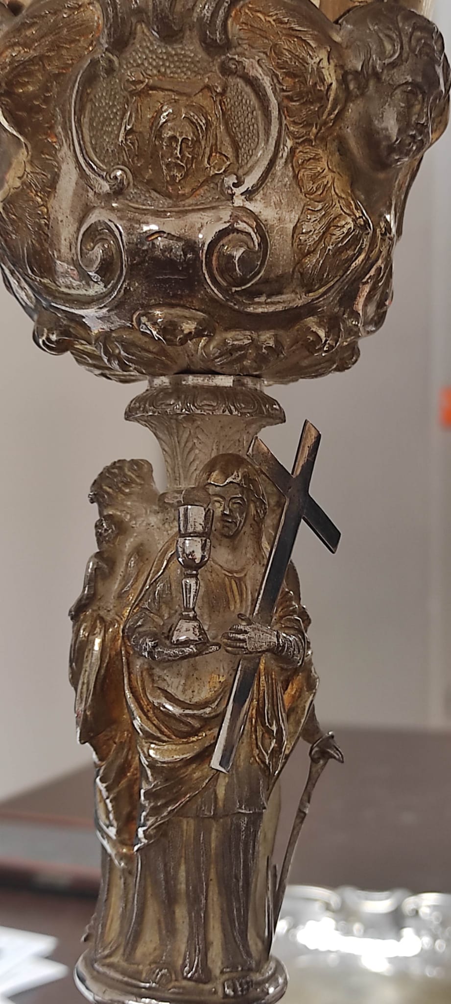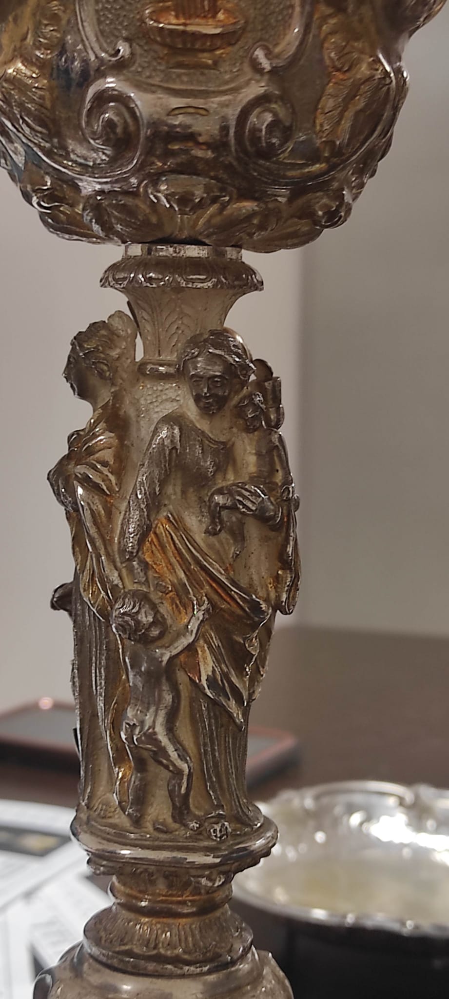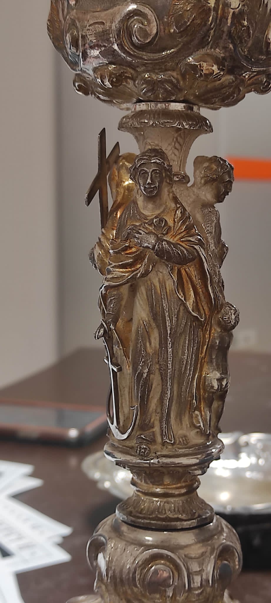 Calice composto da piede a base sagomata con collo decorato da volute fogliacee, fusto figurato con le “Virtù teologali” e sottocoppa scandito da tre “Testine alate”