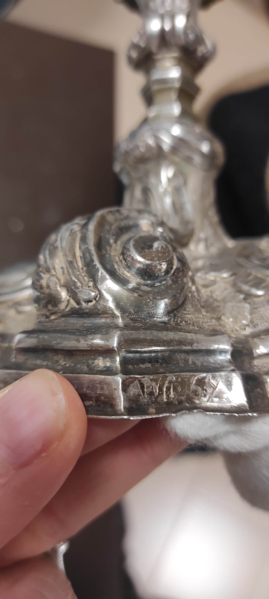 calice con piede a base modanata e collo scandito da volute a ricciolo tra le quali sono cartocci; fusto con nodo a sezione sagomata e sottocoppa decorato da volute e motivi fogliacei