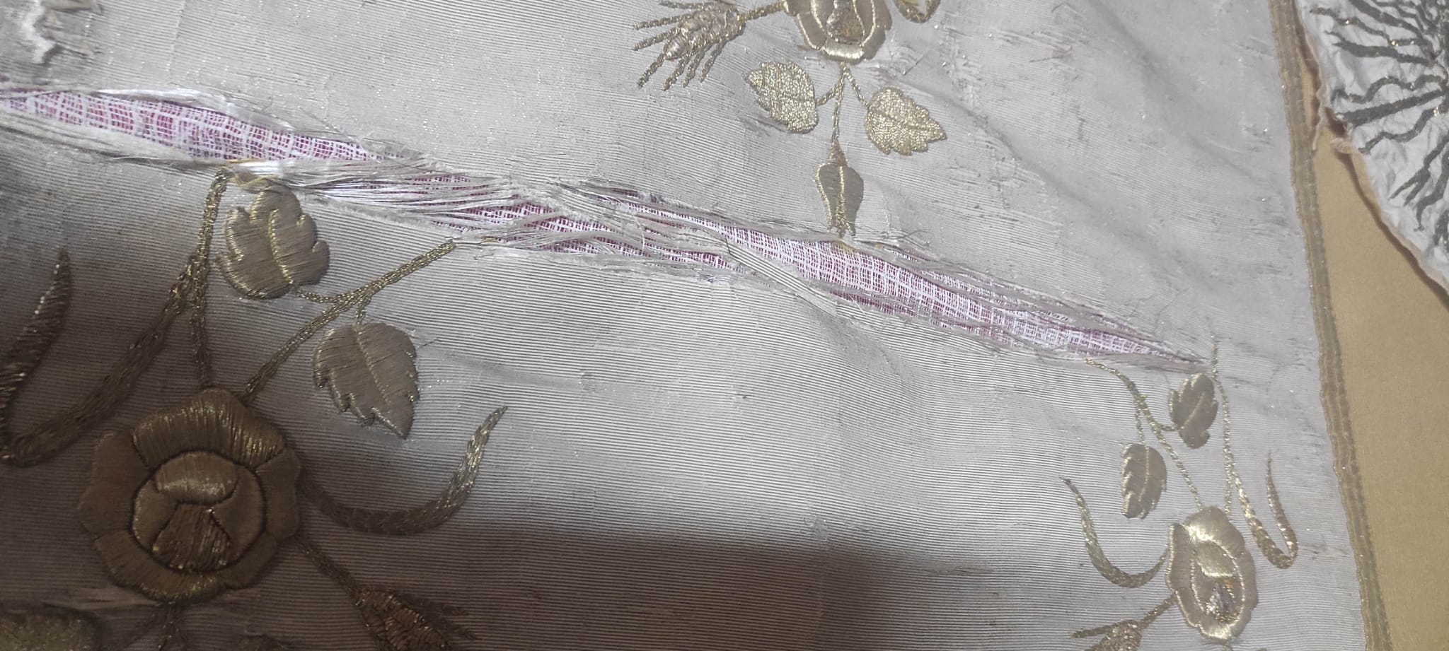 Lunga striscia di stoffa foderata e decorata a ricamo con motivi floreali a mazzetti; al centro, entro tondo raggiato, è ricamato in filo oro il monogramma eucaristico
